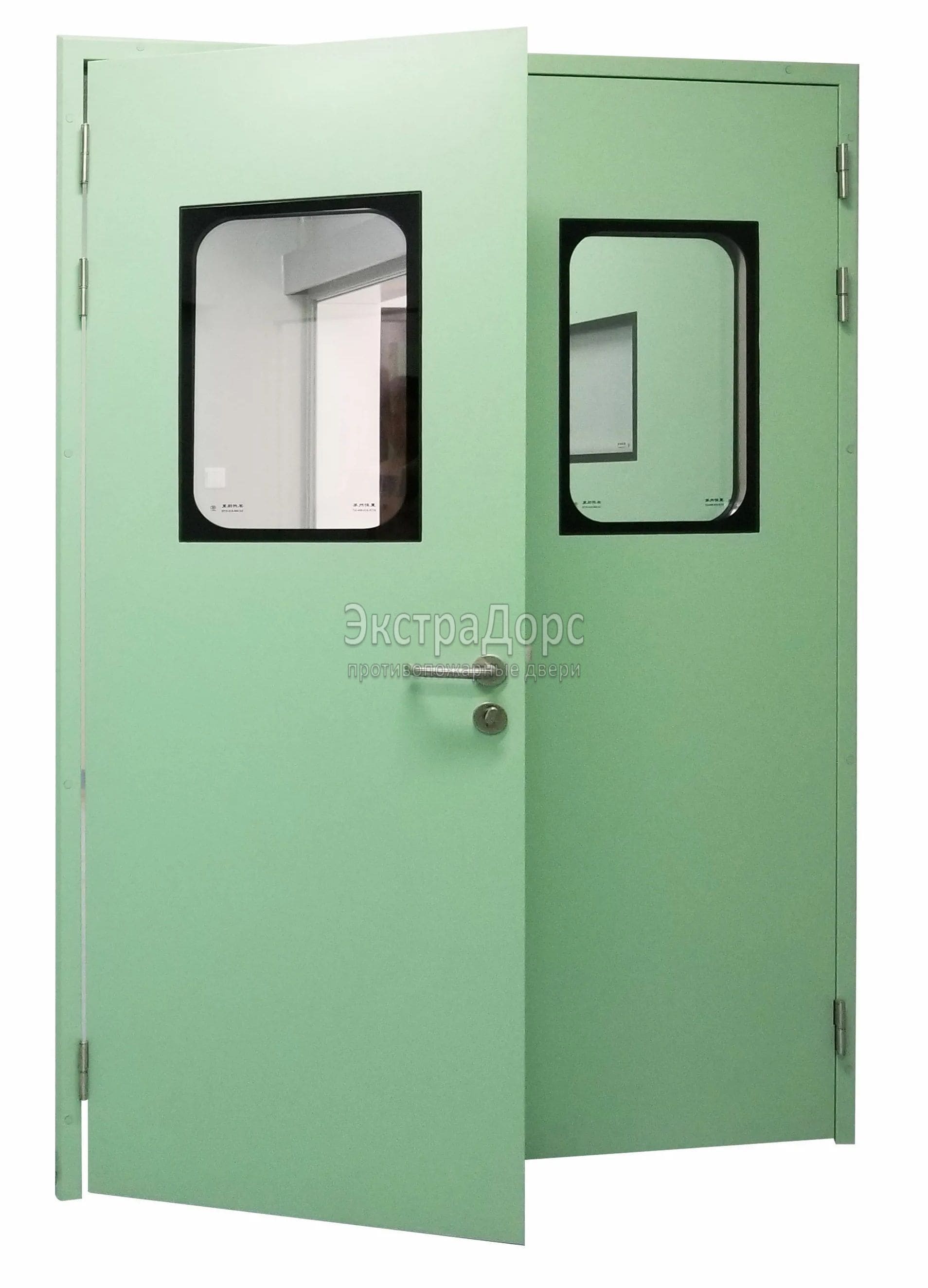 Двухстворчатая огнестойкая дверь EIW 60 зеленая со стеклом в Щёлково